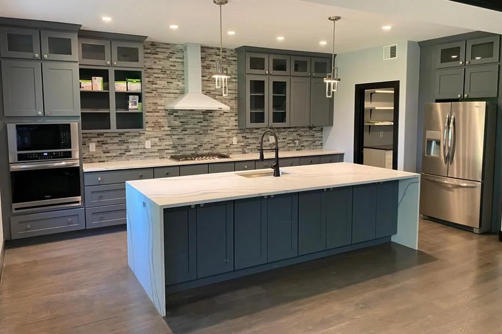 This breathtaking full kitchen remodel exemplifies a meticulously crafted design, where every element harmonizes to create a sophisticated aesthetic. The hood emerges as the striking focal point, its bold design and prominent placement drawing the eye while anchoring the space with a sense of grandeur. The wet bar complements this centerpiece with stylish wine cubes integrated seamlessly into the layout, paired with elegant floating shelves that lend an airy, modern touch while showcasing decorative items. Thoughtful convenience is woven into the design with ample storage solutions and a sleek bar sink, crafted to enhance functionality without compromising style. The bold, dark-accented island adds depth and drama with its striking contrast against lighter tones, its compact footprint optimized with additional seating tailored to the intimate layout. The overall design balances elegance and practicality, creating a cohesive and inviting atmosphere perfect for both daily use and entertaining.